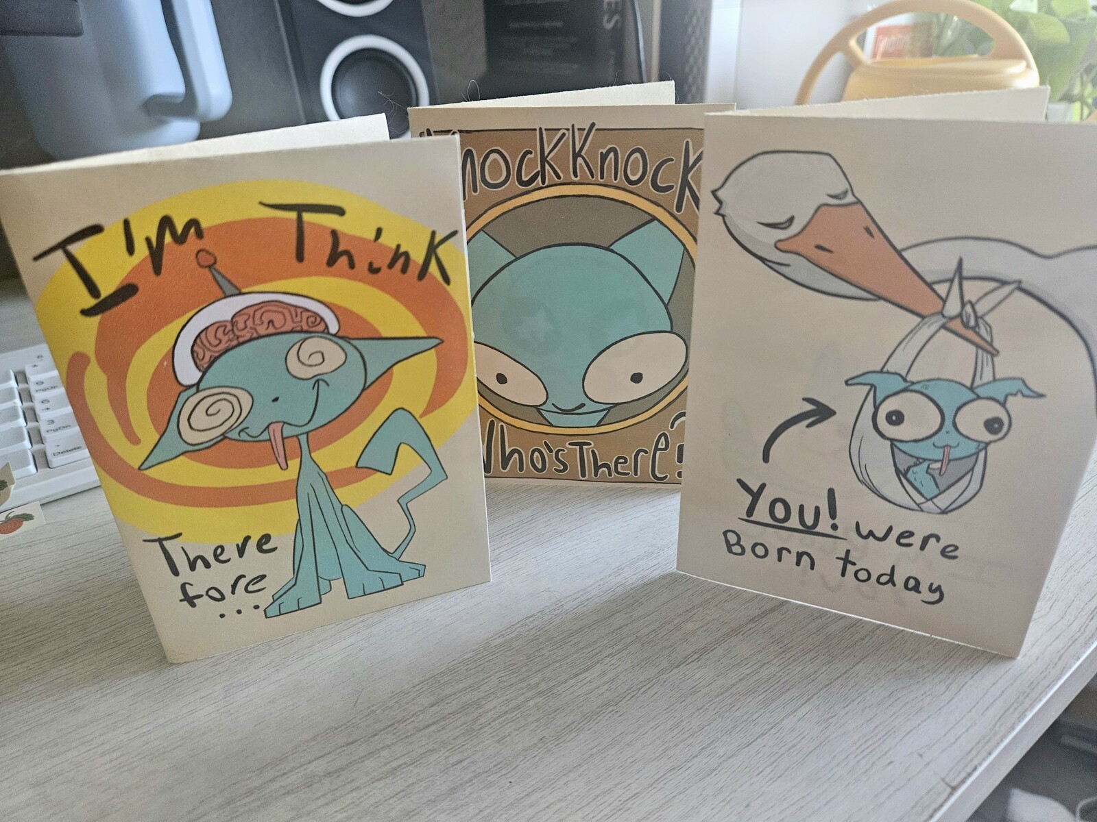 I made hand cut cards. The idea of the project came from this idea of marketability, what sort of mascot can I stomach to make. Blevin from the I'm Blove You seires is my own spin on that.
